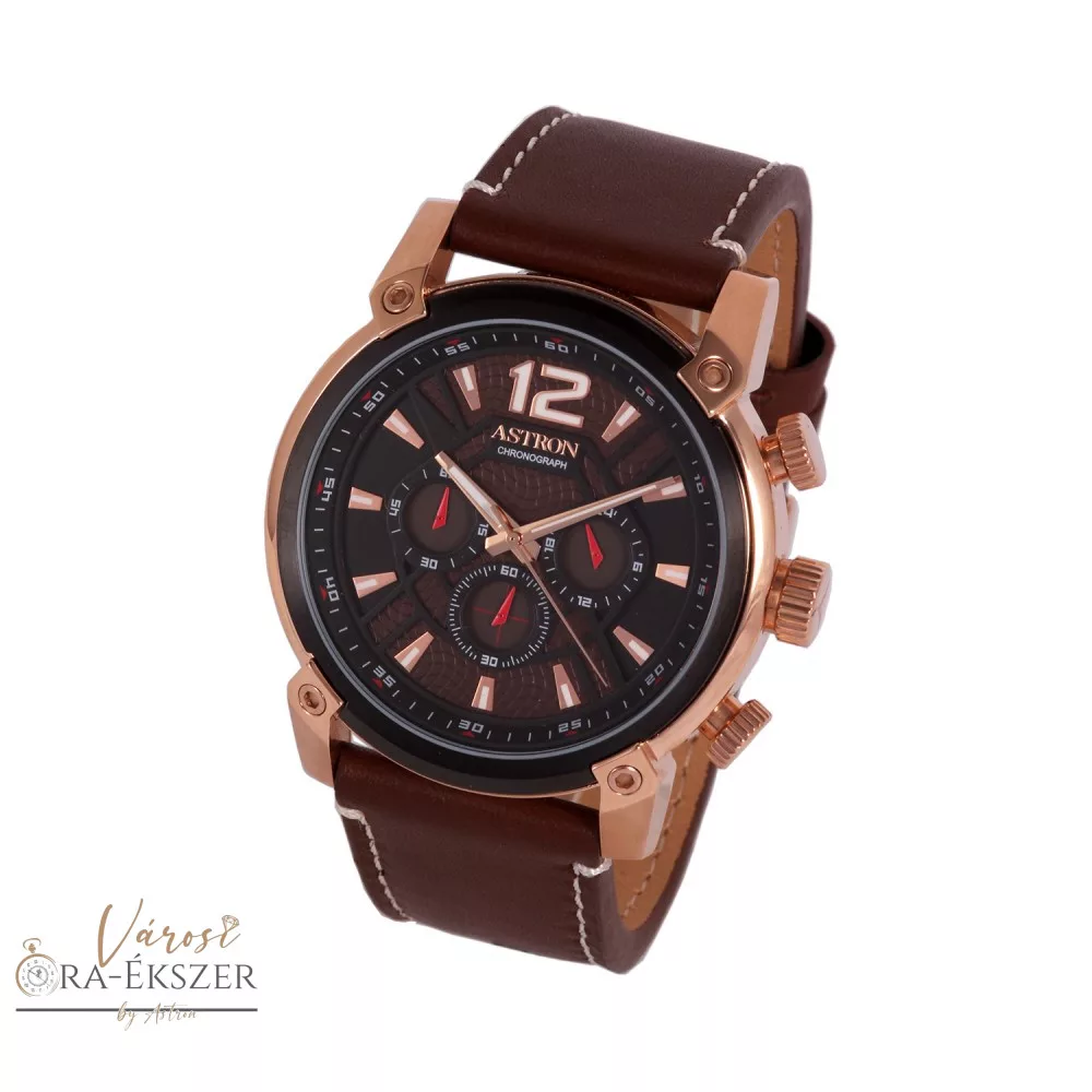 ASTRON 5538-1 férfi karóra, rózsaarany színű nemesacél tok, barna bőrszíj, barna számlap, keményített ásványüveg, chronograph quartz szerkezet, 50 m (5 ATM) vízállóság