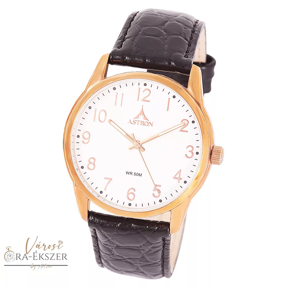 ASTRON 5552-0 férfi karóra, rózsaarany színű nemesacél tok, fekete bőrszíj, fehér számlap, keményített ásványüveg, quartz szerkezet, 50 m (5 ATM) vízállóság