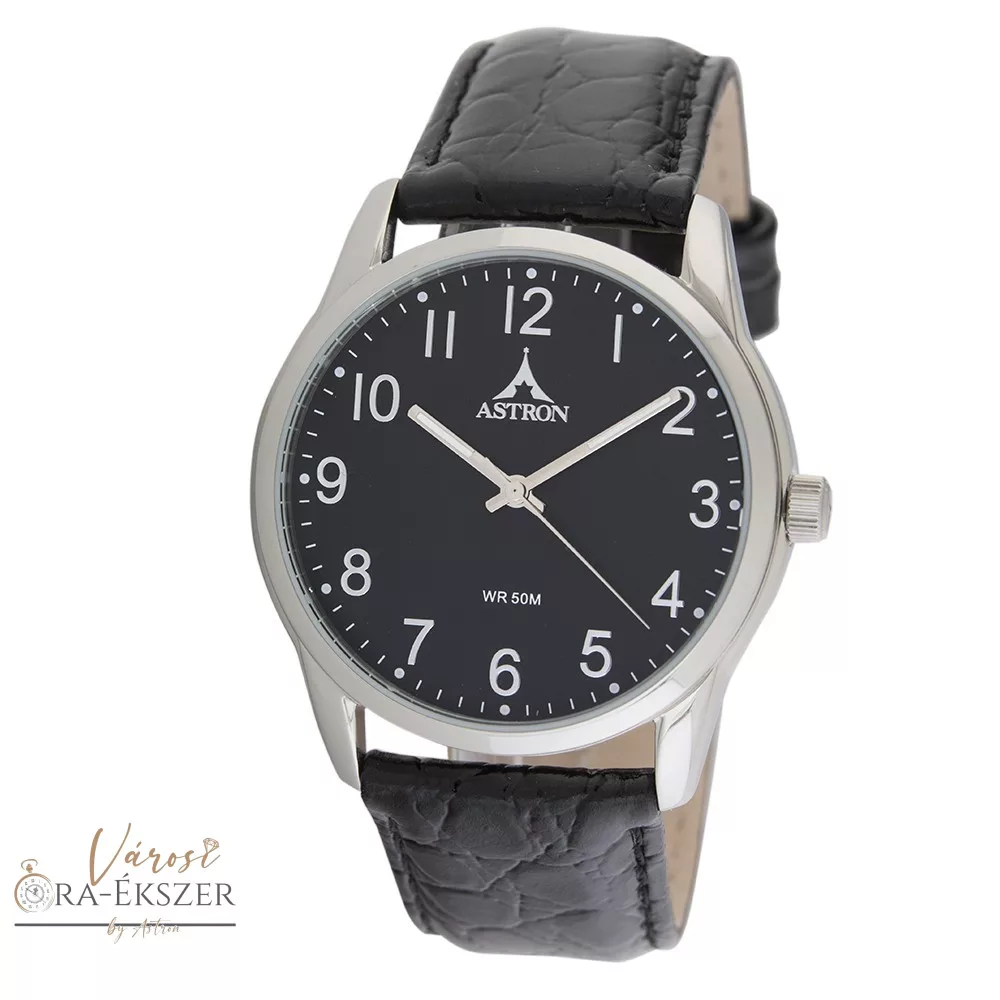 ASTRON 5552-1 férfi karóra, ezüst színű nemesacél tok, fekete bőrszíj, fekete számlap, keményített ásványüveg, quartz szerkezet, 50 m (5 ATM) vízállóság