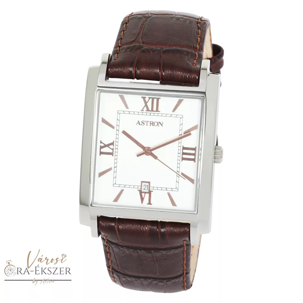ASTRON 5553-7 férfi karóra, ezüst színű nemesacél tok, barna bőrszíj, fehér számlap, keményített ásványüveg, quartz szerkezet, 50 m (5 ATM) vízállóság
