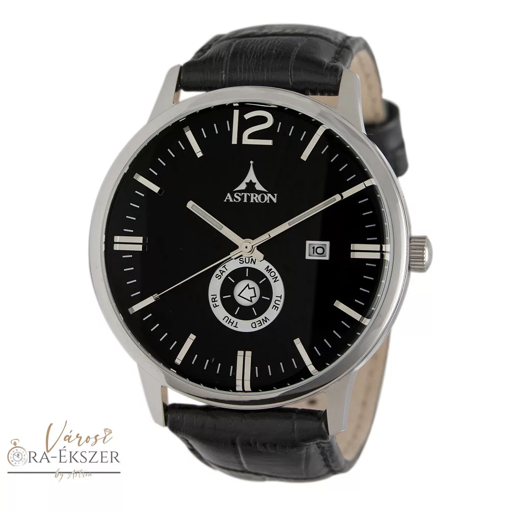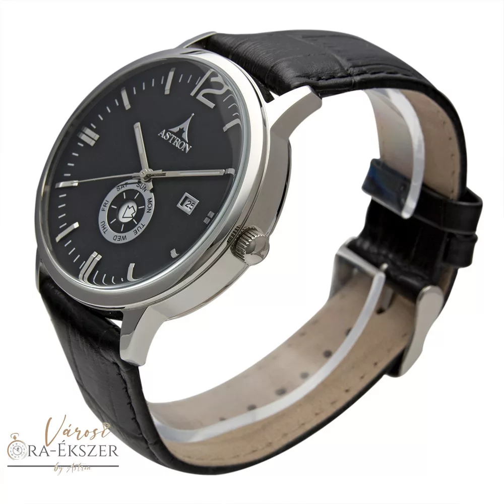 ASTRON 5554-1 férfi karóra, ezüst színű nemesacél tok, fekete bőrszíj, fekete számlap, keményített ásványüveg, quartz szerkezet, 50 m (5 ATM) vízállóság