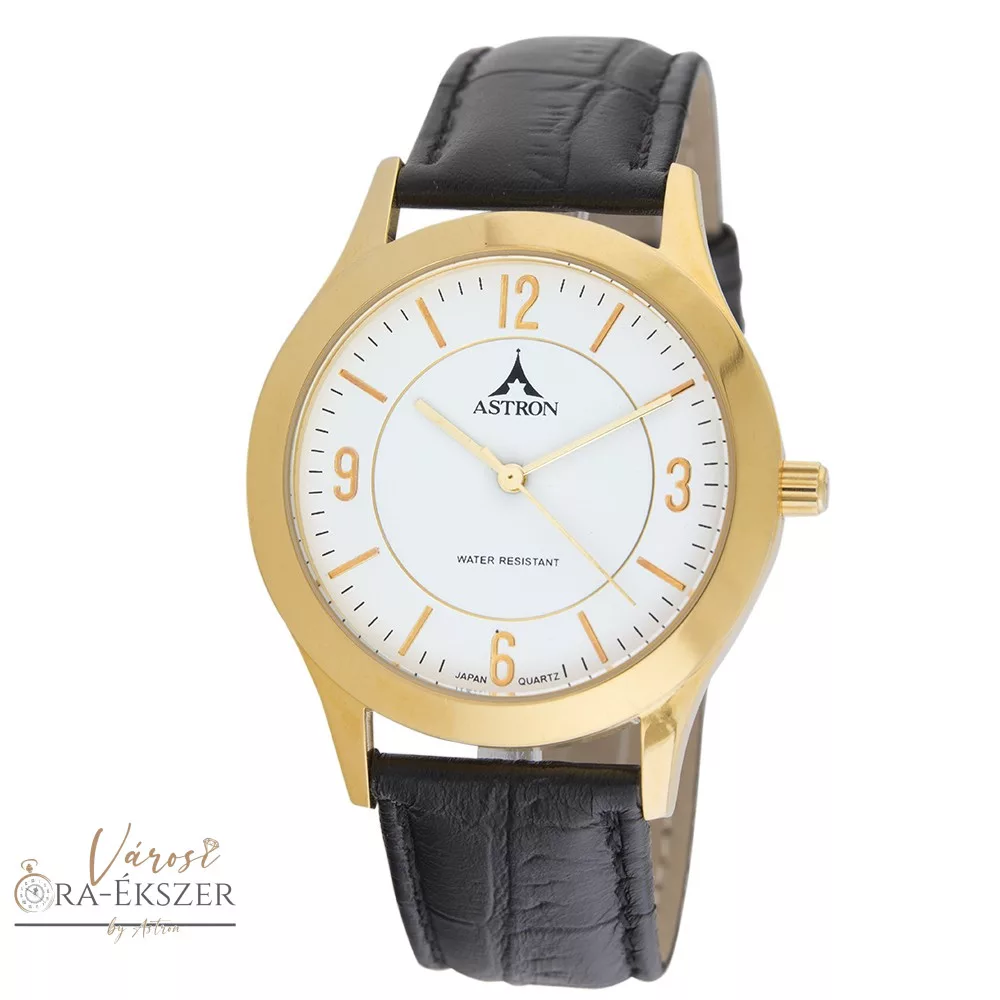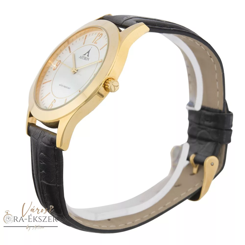 ASTRON 5566-0 férfi karóra, arany színű nemesacél tok, fekete bőrszíj, fehér számlap, keményített ásványüveg, quartz szerkezet, cseppmentes vízállóság