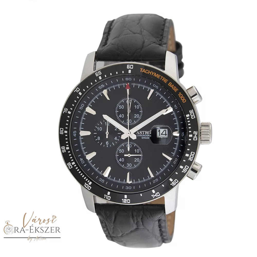 ASTRON 5575-1 férfi karóra, chronograph, ezüst színű nemesacél tok, fekete bőrszíj, fekete számlap, keményített ásványüveg, quartz szerkezet, 50 m (5 ATM) vízállóság