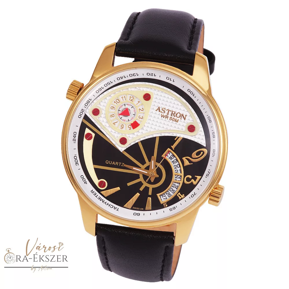 ASTRON 5604-0 férfi karóra, arany színű nemesacél tok, fekete bőrszíj, extravagáns számlap, keményített ásványüveg, multifunkciós quartz szerkezet, 50 m (5 ATM) vízállóság