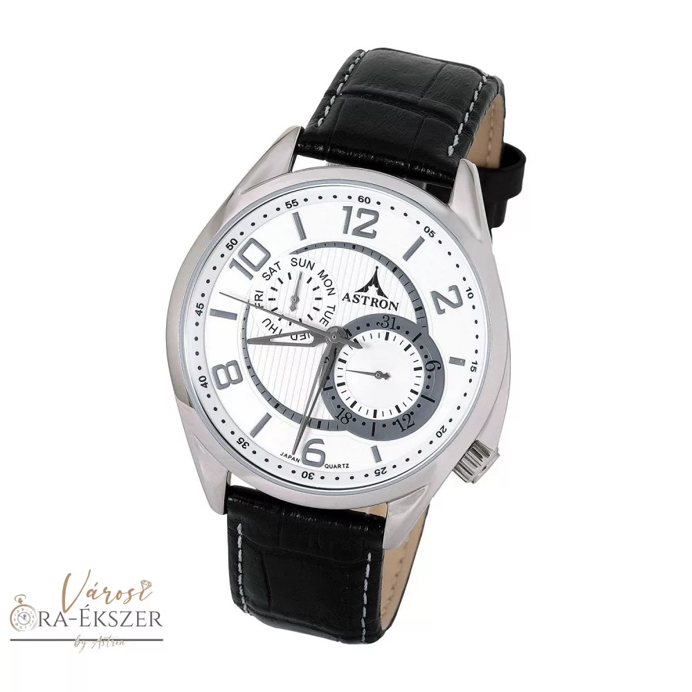 ASTRON 5670-7 férfi karóra, ezüst színű nemesacél tok, fekete bőrszíj, fehér számlap, keményített ásványüveg, quartz szerkezet, 50 m (5 ATM) vízállóság
