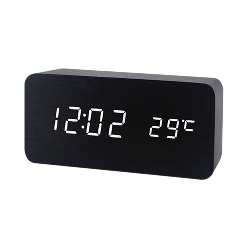Sötétszürke fa erezetű digitális asztali óra fehér LED világítással és komplex funkciókkal