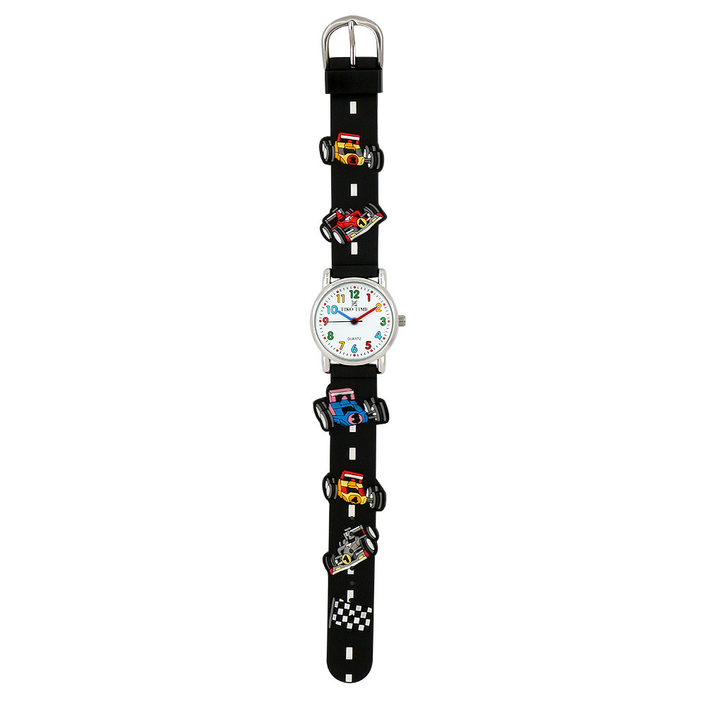 Tiko Time karóra gyerekeknek, ezüst színű fémtok, quartz szerkezet, 3D figurás fekete műanyag szíj, fehér arab számos számlap, cseppmentes vízállóság