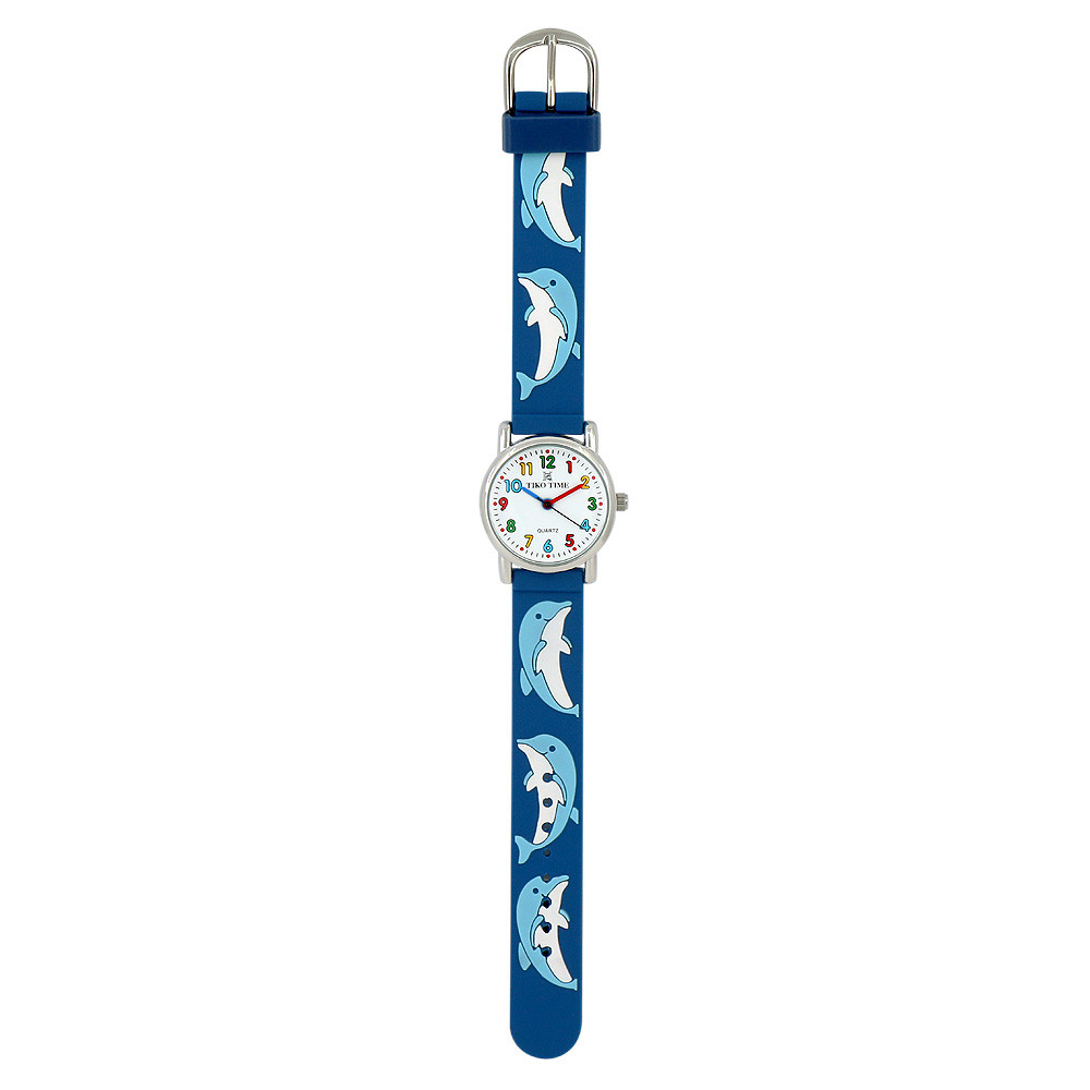 Tiko Time karóra gyerekeknek, ezüst színű fémtok, quartz szerkezet, 3D figurás kék műanyag szíj, fehér arab számos számlap, cseppmentes vízállóság