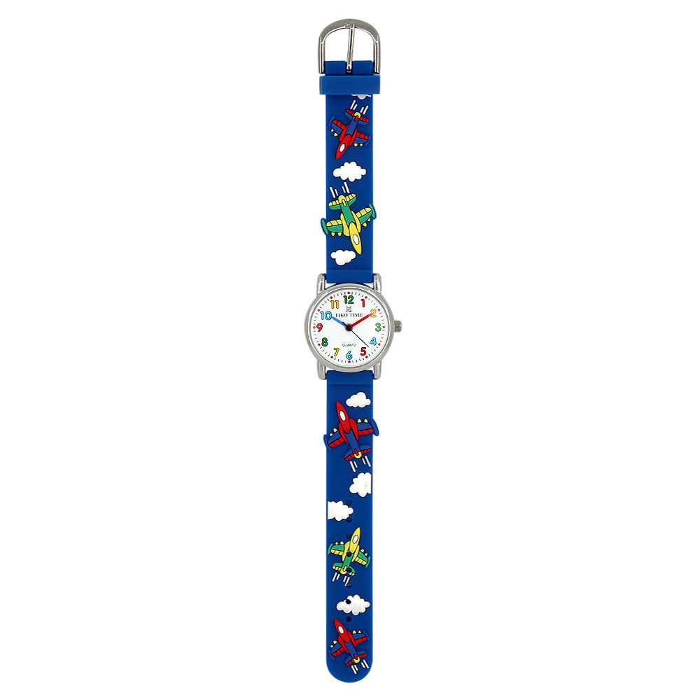 Tiko Time karóra gyerekeknek, ezüst színű fémtok, quartz szerkezet, 3D figurás kék műanyag szíj, fehér arab számos számlap, cseppmentes vízállóság