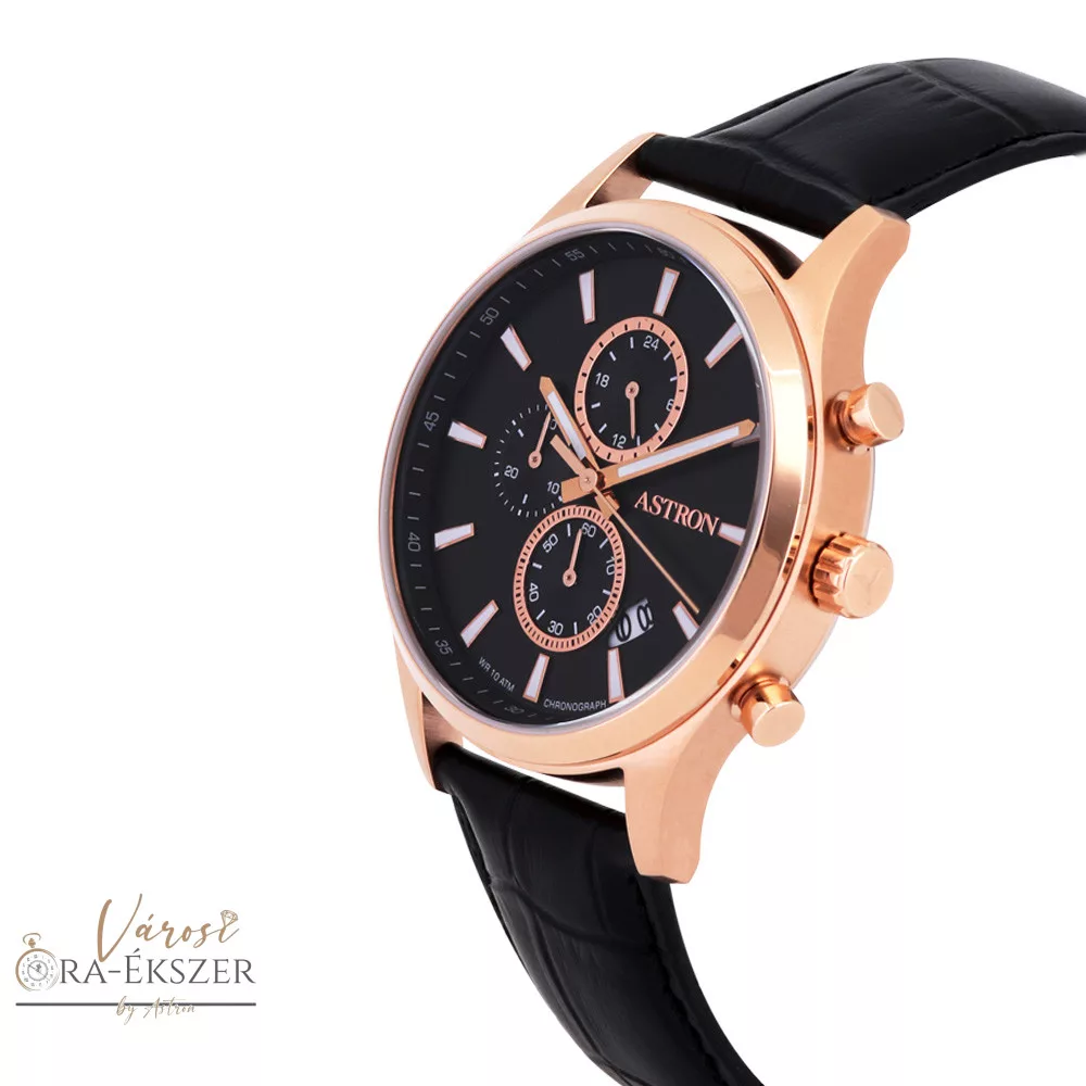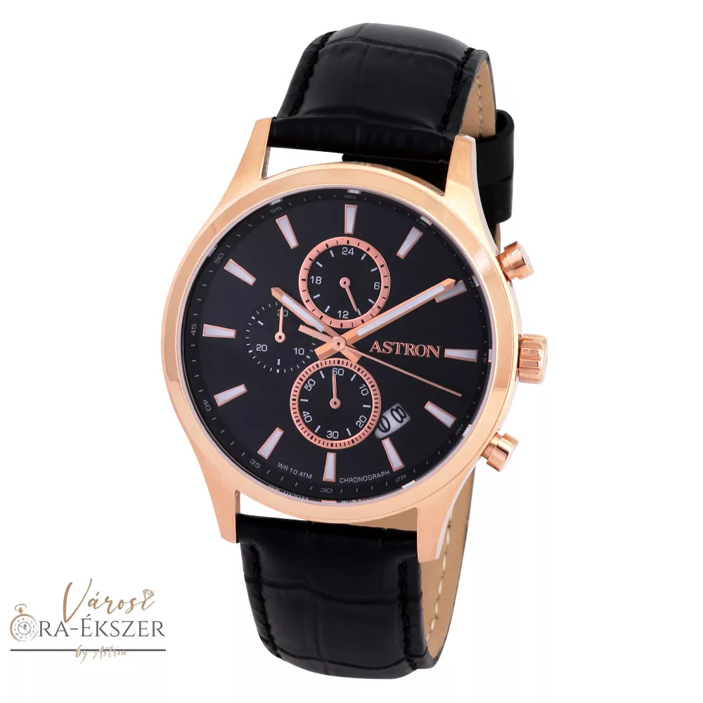 ASTRON 8040-0 férfi karóra, chronograph, rózsaarany színű nemesacél tok, fekete bőrszíj, fekete számlap, keményített ásványüveg, quartz szerkezet, 100 m (10 ATM) vízállóság