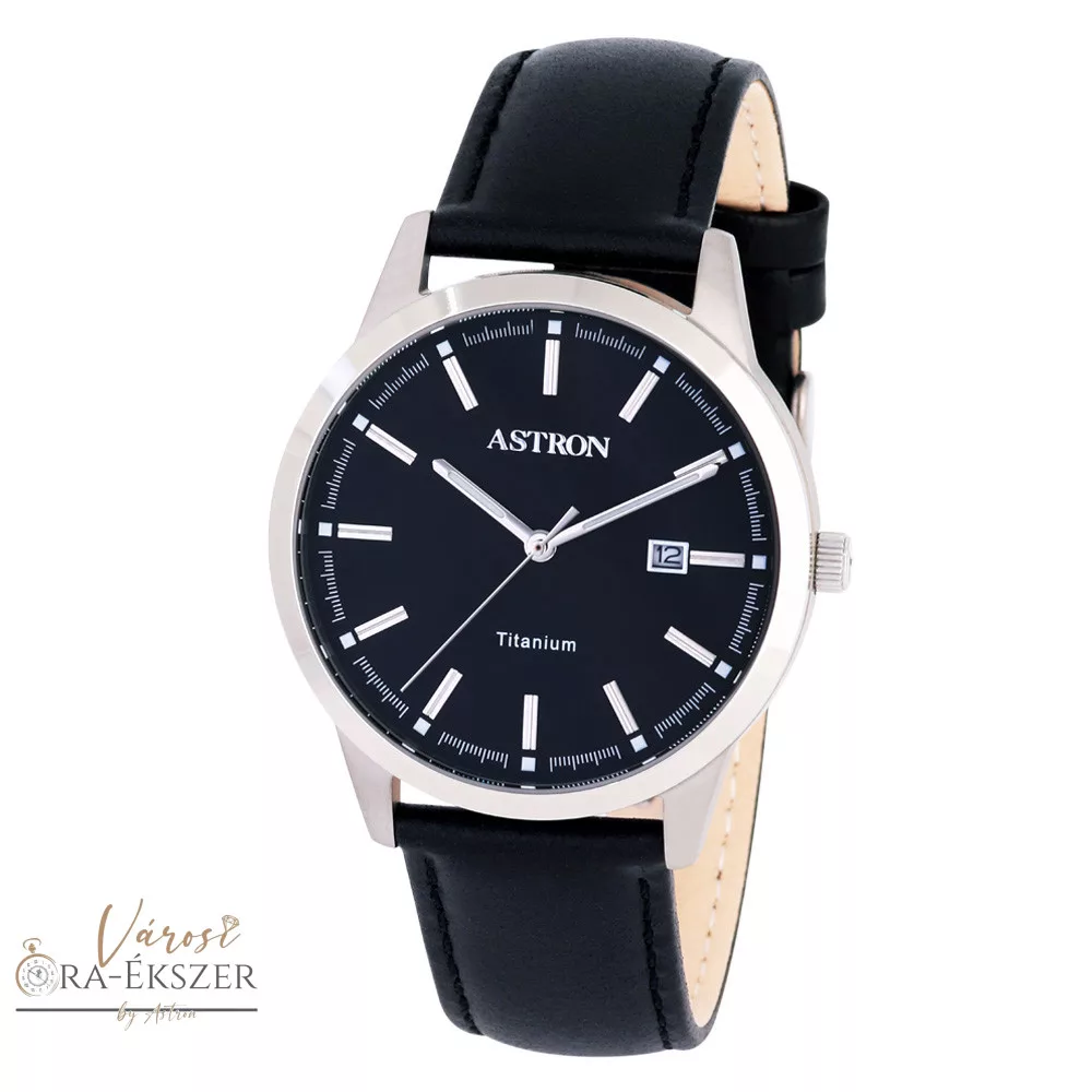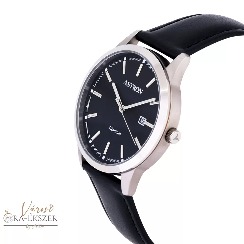 ASTRON 8043-1 férfi karóra, ezüst színű titánium tok, fekete bőrszíj, fekete számlap, keményített ásványüveg, quartz szerkezet, 50 m (5 ATM) vízállóság