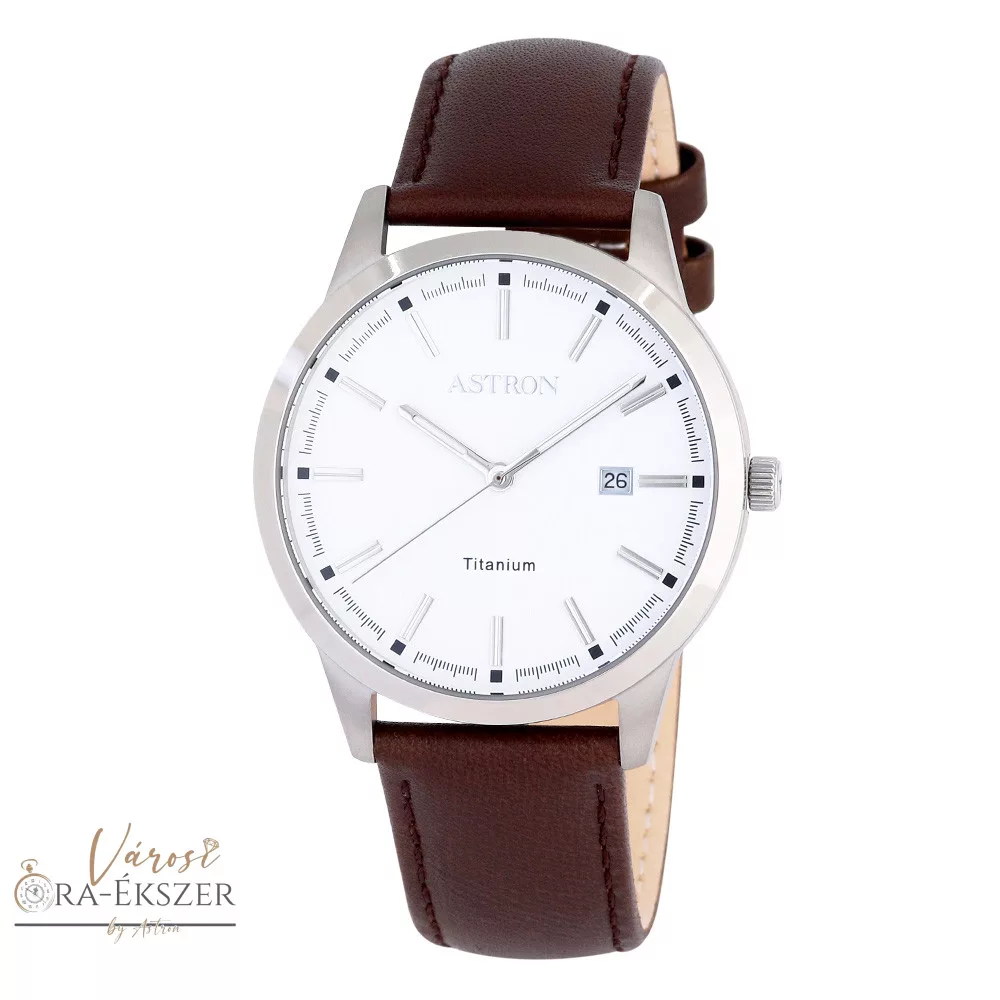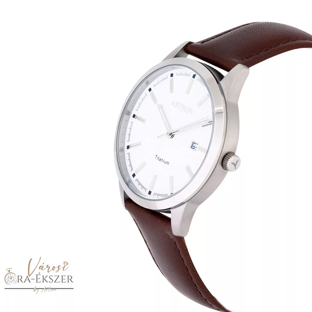 ASTRON 8043-7 férfi karóra, ezüst színű titánium tok, barna bőrszíj, fehér számlap, keményített ásványüveg, quartz szerkezet, 50 m (5 ATM) vízállóság