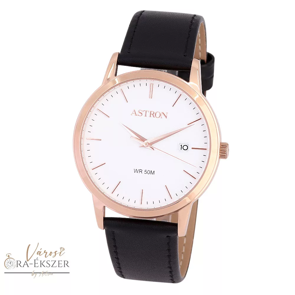 ASTRON 8046-0 férfi karóra, rózsaarany színű nemesacél tok, fekete színű bőrszíj, fehér számlap, keményített ásványüveg, quartz szerkezet, 50 m (5 ATM) vízállóság