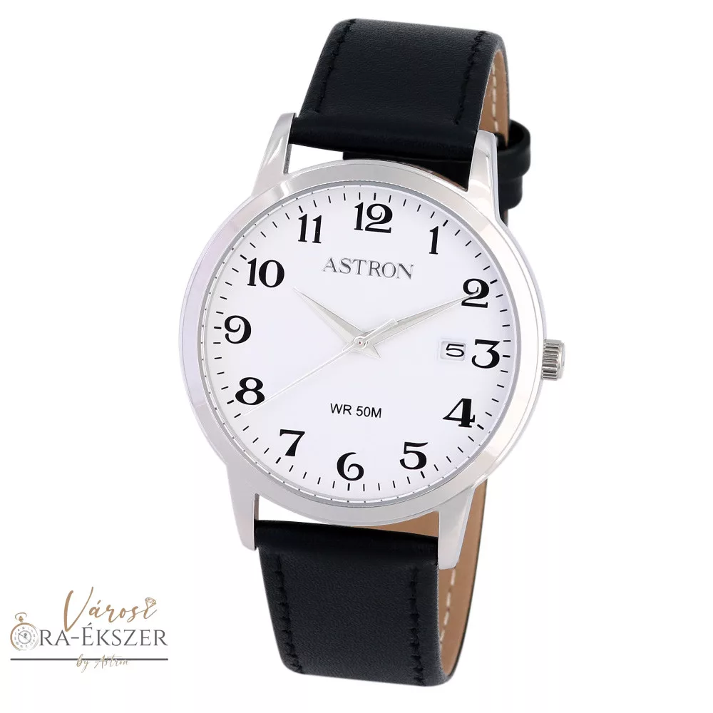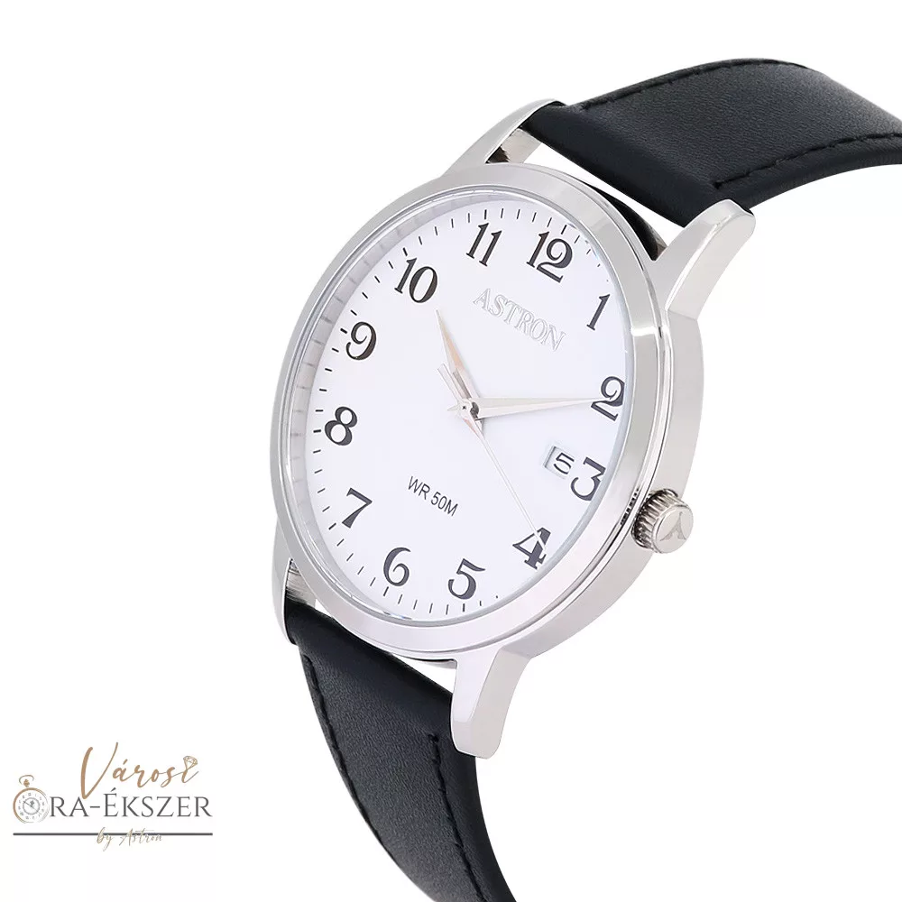 ASTRON 8046-7 férfi karóra, ezüst színű nemesacél tok, fekete színű bőrszíj, fehér számlap, keményített ásványüveg, quartz szerkezet, 50 m (5 ATM) vízállóság