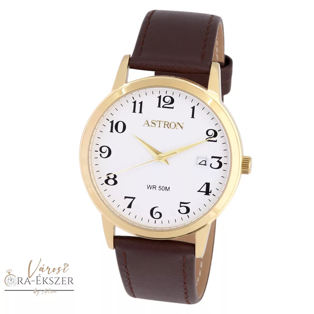 ASTRON 8046-9 férfi karóra, arany színű nemesacél tok, barna színű bőrszíj, fehér számlap, keményített ásványüveg, quartz szerkezet, 50 m (5 ATM) vízállóság