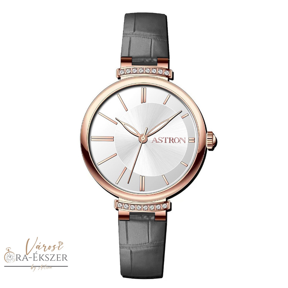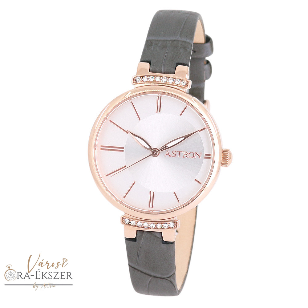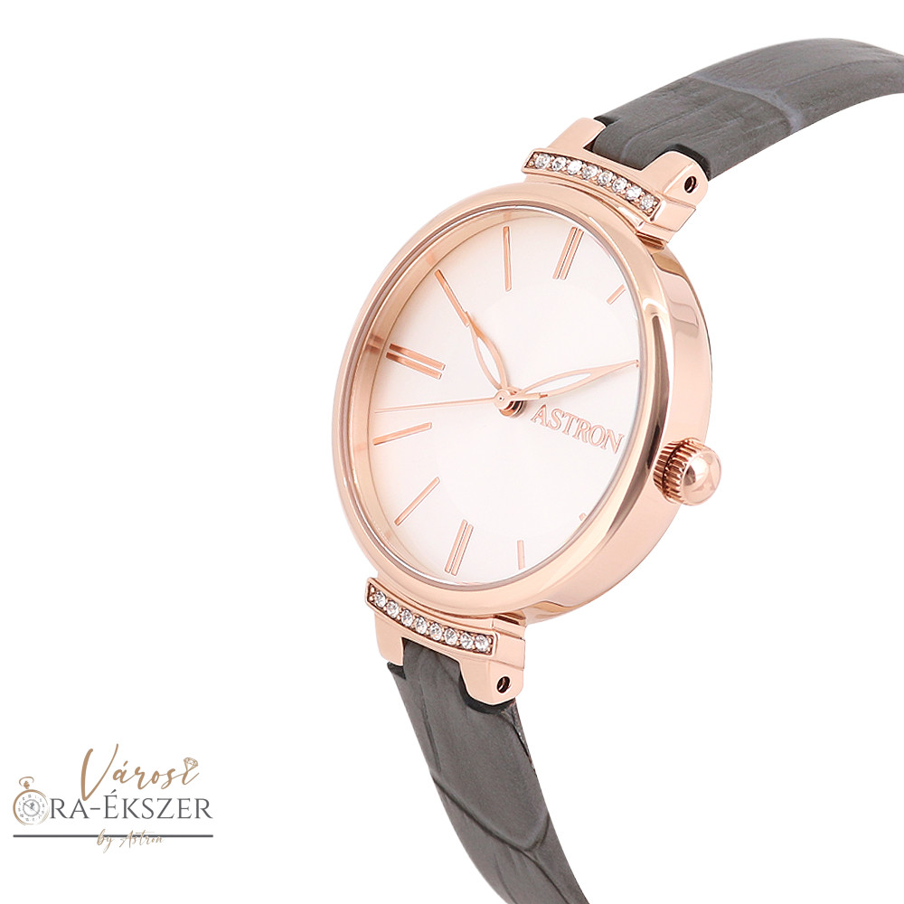 ASTRON 8056-5 női karóra, rózsaarany színű acél tok, szürke színű bőrszíj, ezüst színű számlap, keményített ásványüveg, quartz szerkezet, cseppmentes (3 ATM) vízállóság