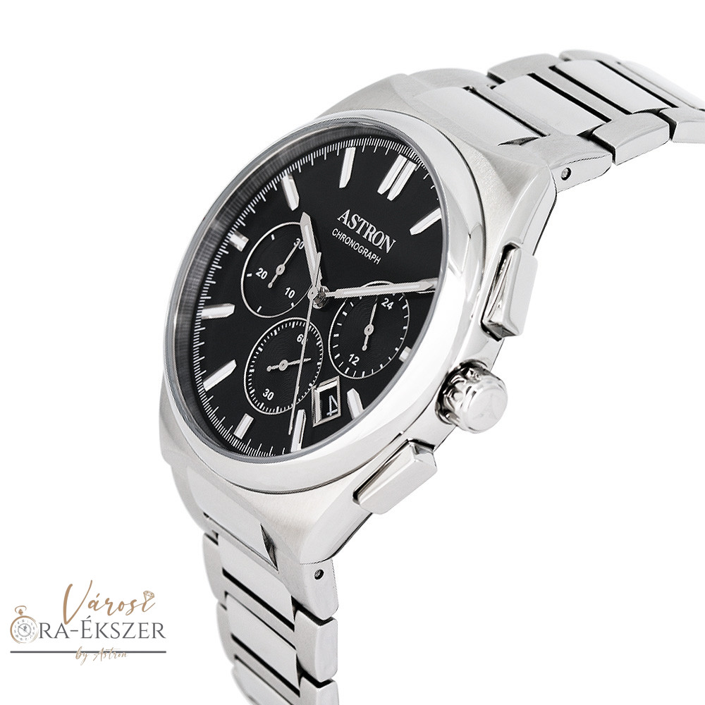 ASTRON 8058-1 férfi karóra, chronograph, ezüst színű nemesacél tok, ezüst színű nemesacél csat, fekete számlap, keményített ásványüveg, quartz szerkezet, 5 ATM vízállóság