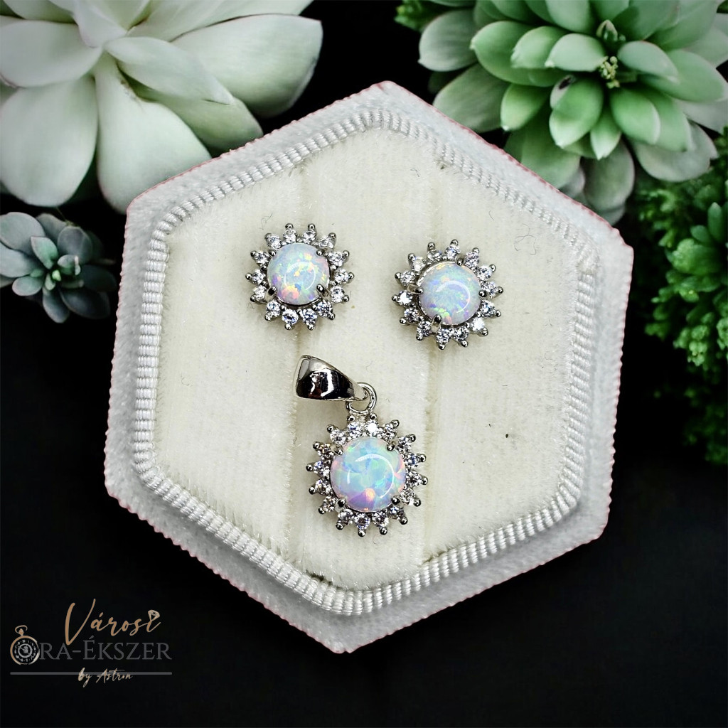 925 EZÜST FÜLBEVALÓ ÉS MEDÁL SZETT FEHÉR OPÁL KŐVEL