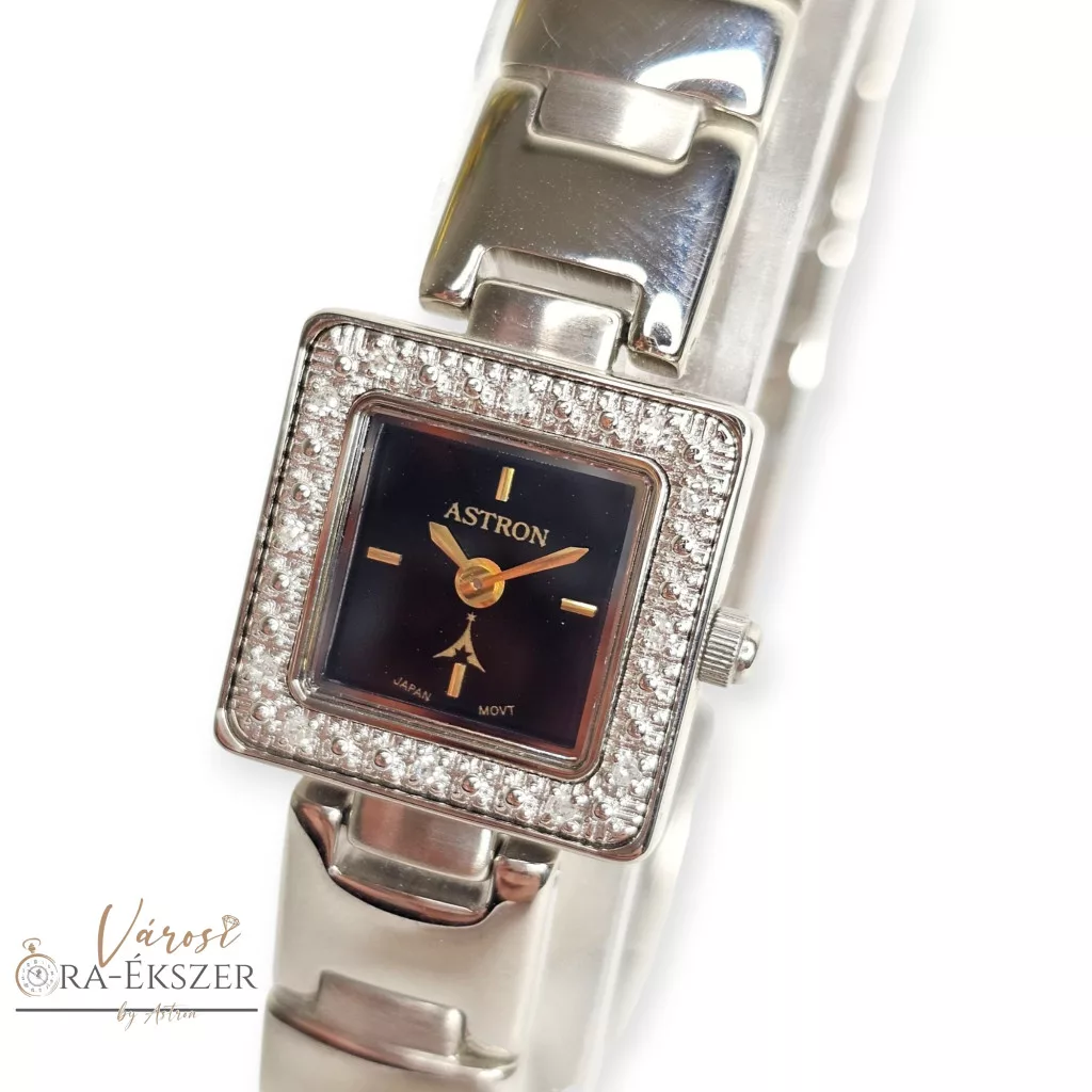 ASTRON 5113-1 női karóra, gyémánt köves ezüst színű fém tok, ezüst színű fémcsat, fekete számlap, keményített ásványüveg, quartz szerkezet, cseppmentes vízállóság
