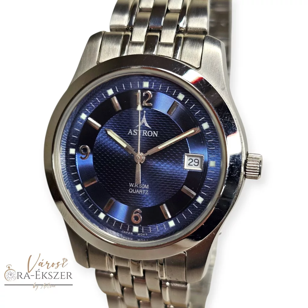 ASTRON 5231-2 férfi karóra, ezüst színű nemesacél tok, ezüst színű nemesacél csat, kék színű számlap, keményített ásványüveg, quartz szerkezet, 50 m (5 ATM) vízállóság, dátumkijelzés