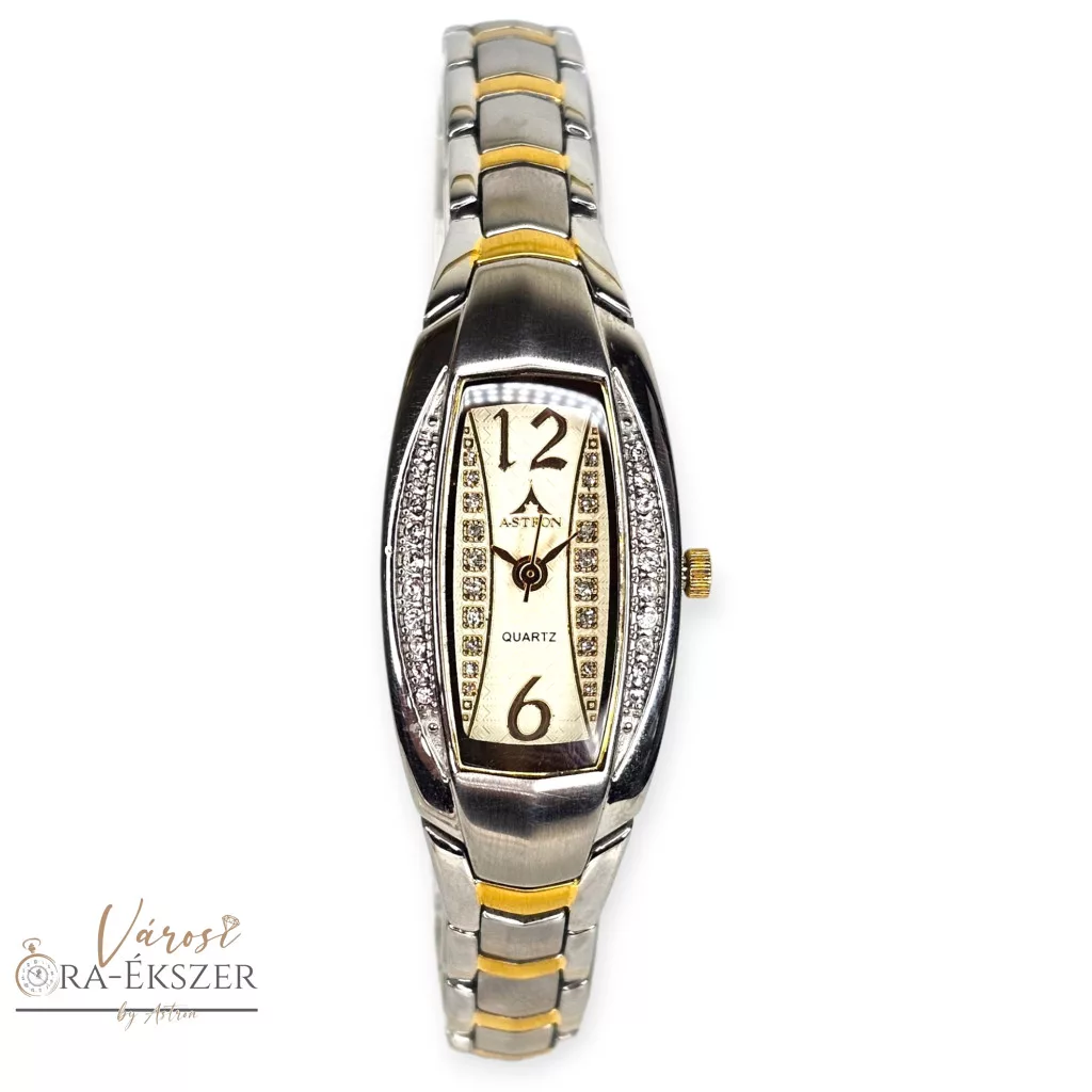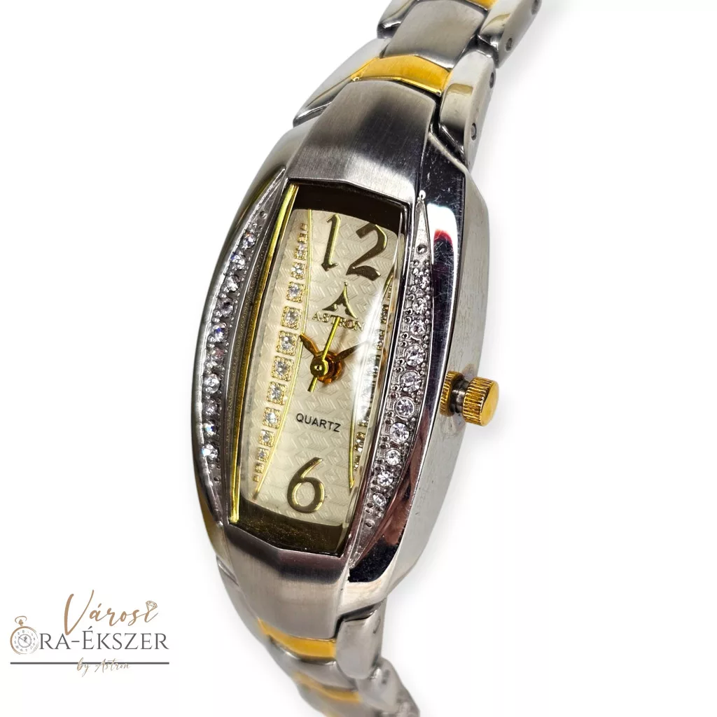 ASTRON 5708-9 női karóra, bicolor fém tok, bicolor fémcsat, pezsgő színű számlap, keményített ásványüveg, quartz szerkezet, cseppmentes vízállóság, dátum kijelzés