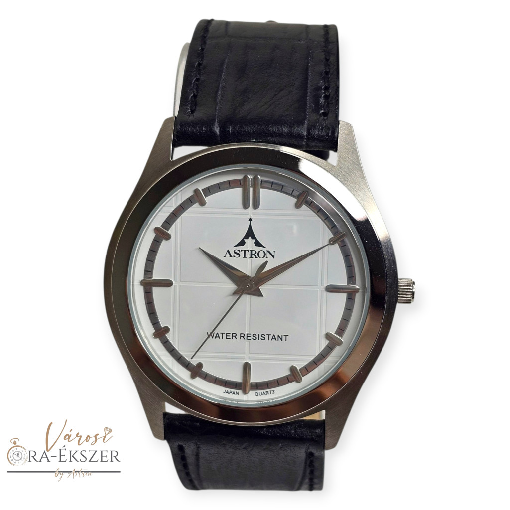 ASTRON 5766-7 férfi karóra, ezüst színű nemesacél tok, fekete bőrszíj, fehér színű számlap, keményített ásványüveg, quartz szerkezet, cseppmentes vízállóság