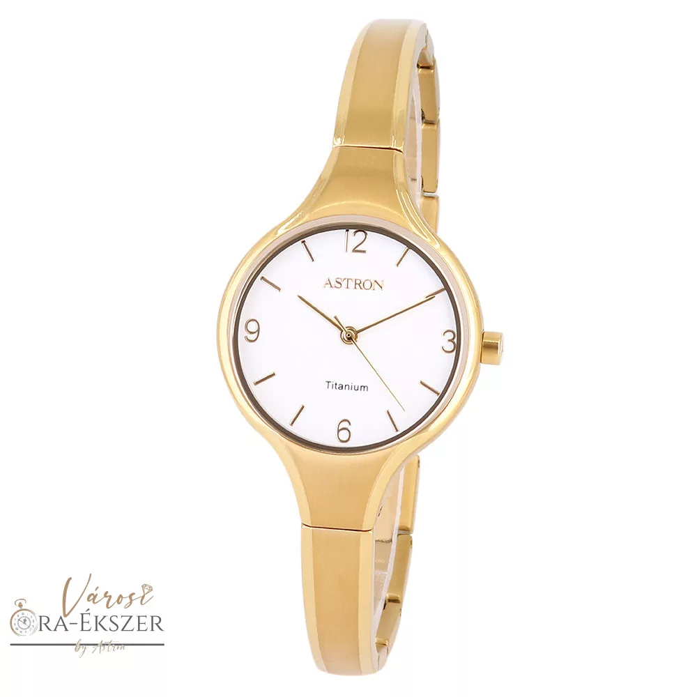 ASTRON 8023-8 női karóra, ékszeróra, arany színű titánium tok, arany színű titánium csat, fehér színű számlap, keményített ásványüveg, quartz szerkezet, cseppmentes vízállóság
