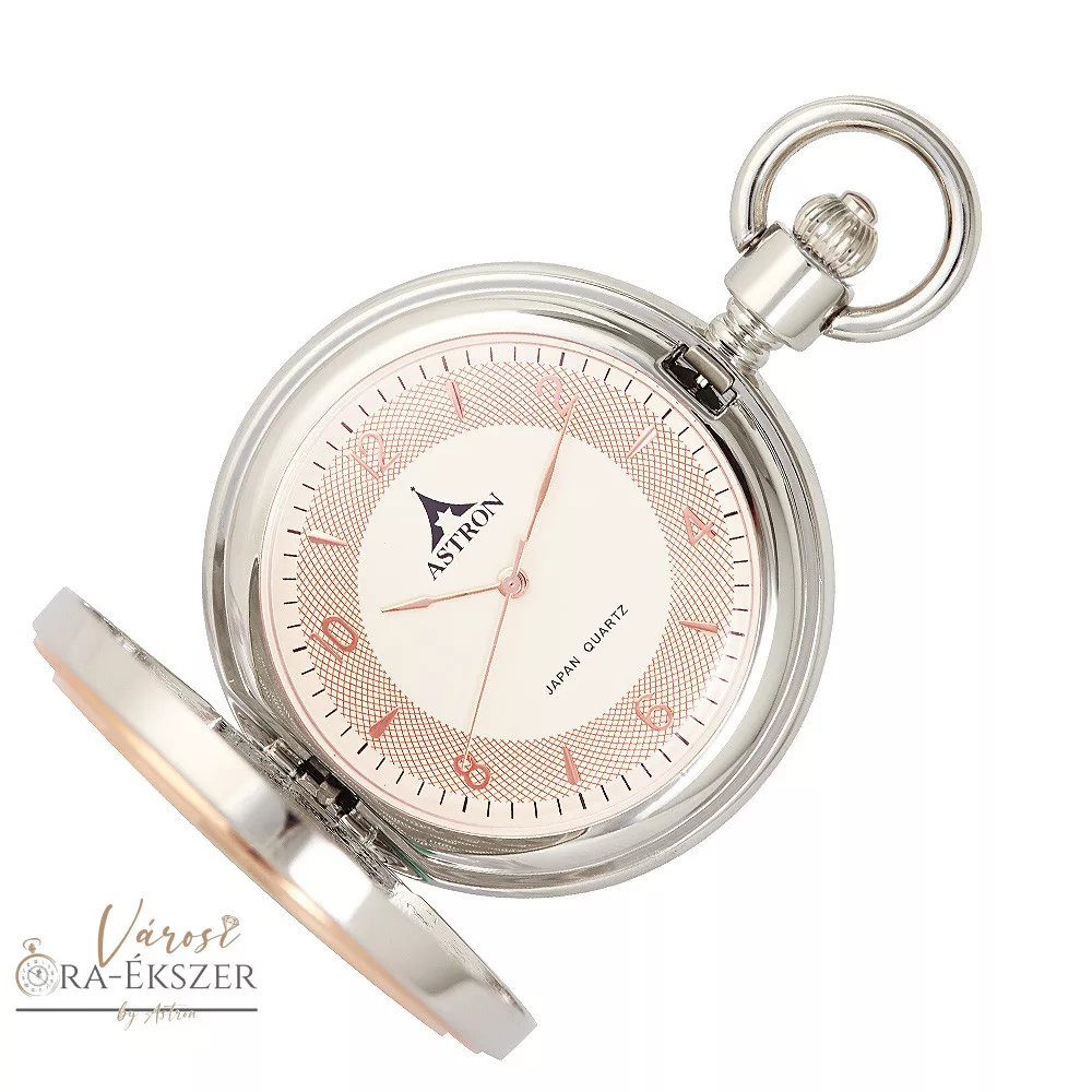 Az Astron férfi zsebóra egy klasszikus kiegészítő modern megoldásokkal. A megbízható quartz szerkezet pontos időmérést biztosít, miközben a zsebóra megőrzi a hagyományos formavilágot és megjelenést. A bicolor, azaz ezüst és rózsaarany színű tok karakteres, mégis visszafogottan elegáns hatást kelt.