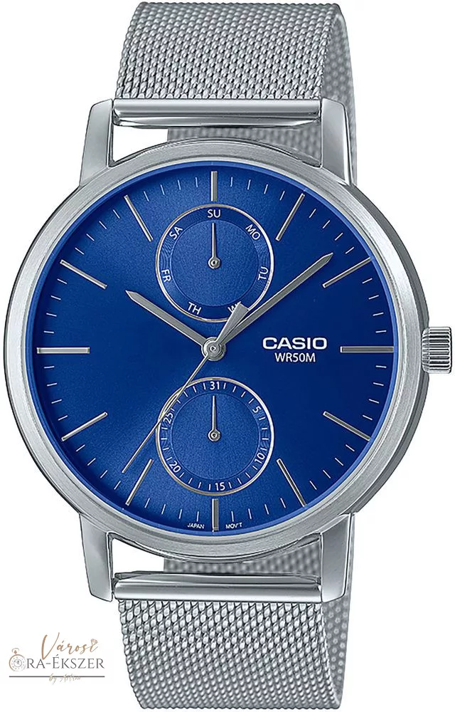 Kulcsszavak: Casio férfi karóra, kék számlapos karóra, fémhálós szíjas karóra, MTP-B310M-2A, elegáns férfi óra, analóg dátumos óra, divatos férfi karóra