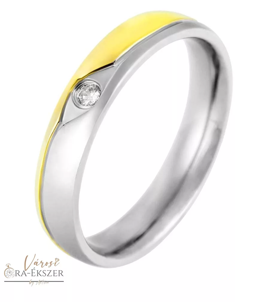 Ez a bicolor (arany és ezüst színű), hullámos mintájú köves nemesacél karikagyűrű női viseletre készült, amely különleges és elegáns megjelenést biztosít. A kerekített forma lágy, nőies vonalvezetést ad, míg a hullámos design egyedi és modern karaktert kölcsönöz az ékszernek.