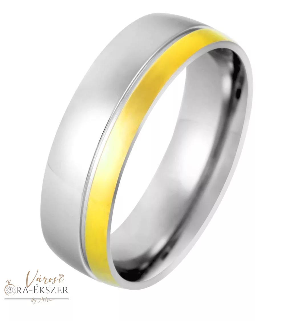 Ez a bicolor (arany és ezüst színű) nemesacél karikagyűrű férfiak számára készült, amely egyszerre modern, elegáns és időtálló. A kerekített forma kényelmes viseletet biztosít, így ideális választás mindennapi használatra is.