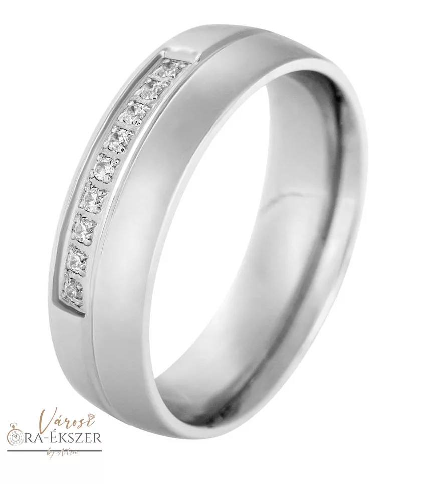 Ez az ezüst színű köves nemesacél karikagyűrű női viseletre készült, amely elegáns és prémium megjelenést biztosít. A kerekített forma lágyabb, finomabb hatást kelt, így különösen nőies és kényelmes viseletet nyújt.
