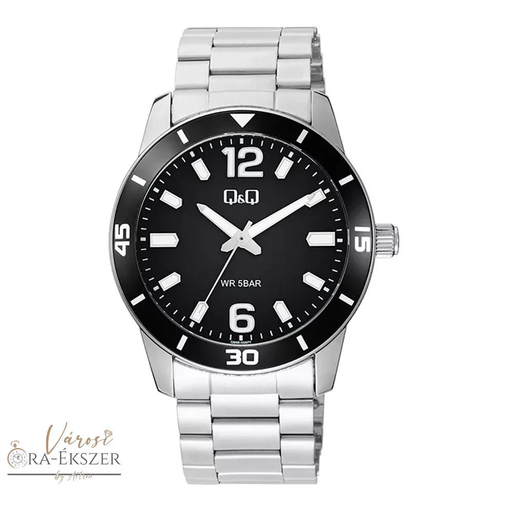 Q&Q férfi karóra, ezüst színű fémtok, ezüst színű nemesacél csat, fekete számlap, Q85B-005PY