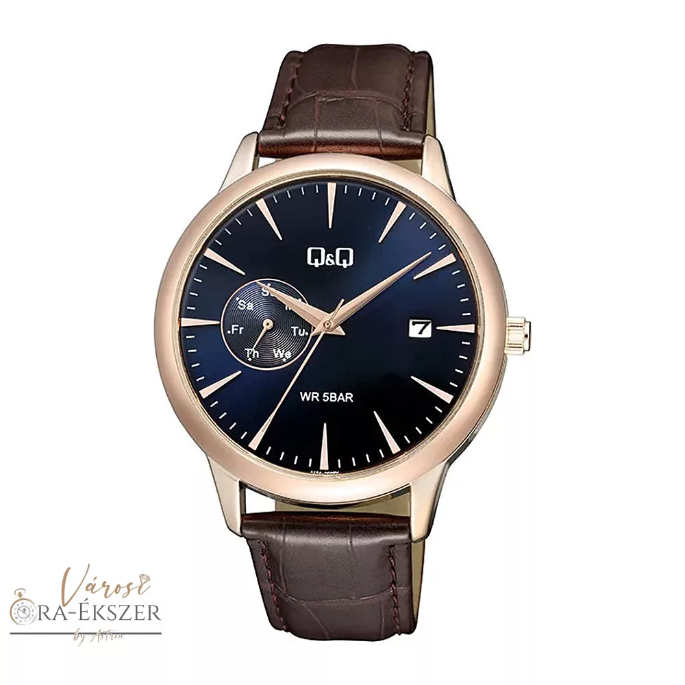 Q&Q férfi karóra, quartz, rózsaarany színű fémtok, barna színű bőrszíj, kék színű számlap, A12A-003PY