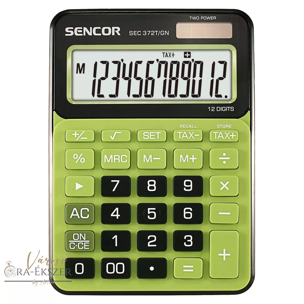 A Sencor SEC 372T praktikus asztali számológép univerzális segédeszközként használható. Fő előnye a 12 számjegyű LCD kijelző, amely lehetővé teszi a kényelmes munkát és a számjegyek jó láthatóságát. A számológép változó jelekkel (+/-), négyzetgyök számítási lehetőséggel, ÁFA számítási funkcióval és háromgombos független memóriával egy szám megjegyzésére, korrigálási és százalékszámítási funkciókkal, ezres helyiérték elválasztóval és dupla nulla (00) gombbal is rendelkezik. A kettős áramellátó rendszer (napelem és akkumulátor) biztosítja a megbízhatóságot, az automata kikapcsolási funkció pedig a hosszú élettartamot garantálja. A SEC 372T méretét tekintve 149 x 104 x 24 mm, amelyhez 120 g súly társul.