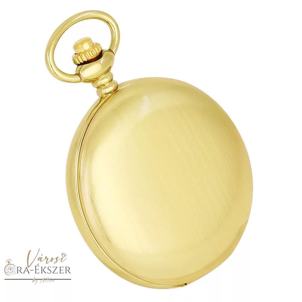 Az arany színű fémtok szálhúzott felülete finom, matt hatást kelt, amely kevésbé gyűjti a kisebb karcokat és ujjlenyomatokat, így a zsebóra hosszabb ideig megőrzi ápolt megjelenését. A klasszikus forma könnyen illeszkedik mellényzsebbe vagy kabátzsebbe, és harmonikusan kiegészíti az öltönyt, zakót vagy elegáns hétköznapi viseletet.