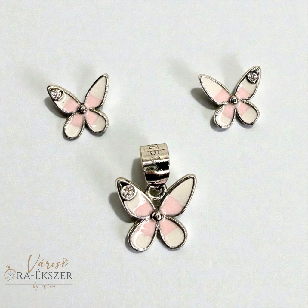 925 EZÜST PILLANGÓS FÜLBEVALÓ ÉS MEDÁL SZETT, ÉKSZER SZETT, RÓZSASZÍN ÉS FEHÉR SZÍNŰ