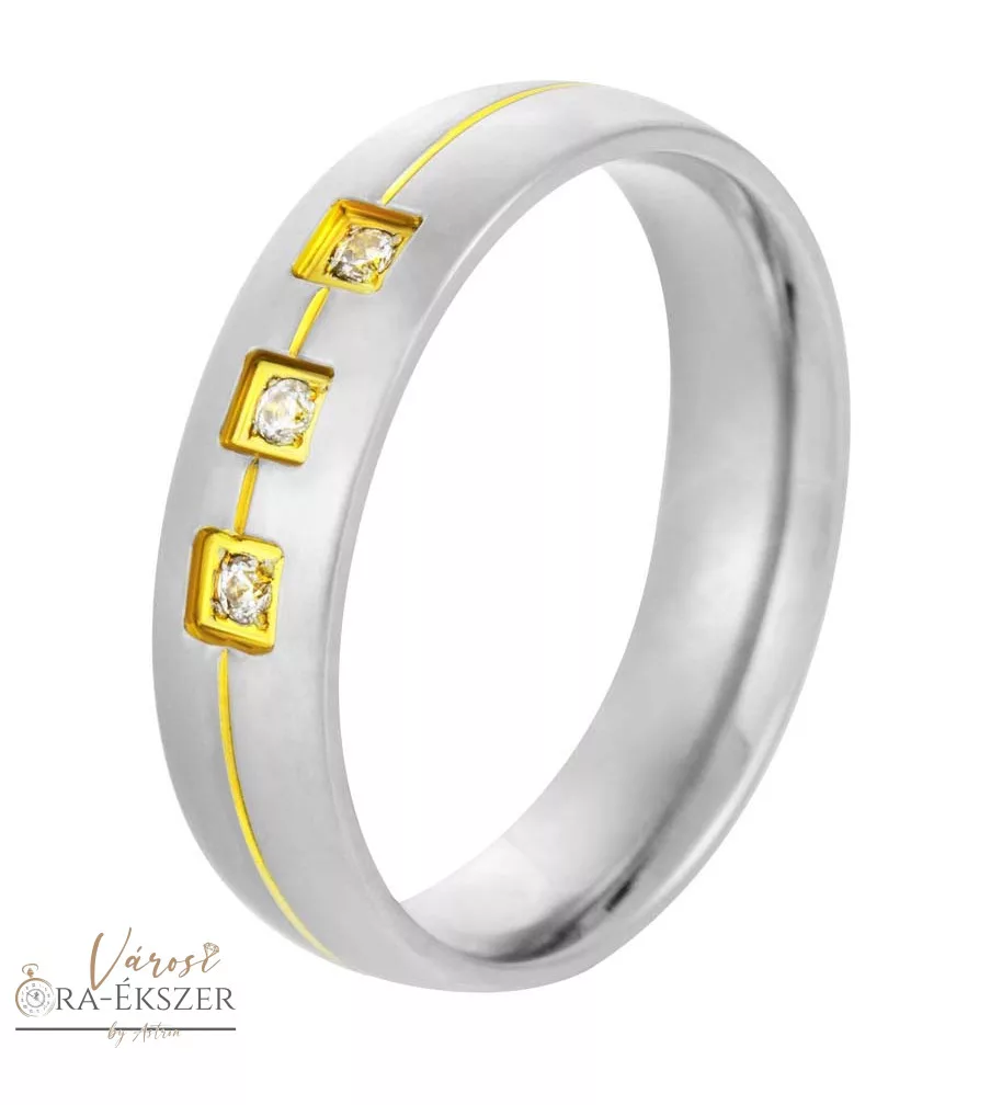 Ez az ezüst-arany színű, köves nemesacél karikagyűrű női viseletre készült, amely elegáns és időtálló megjelenést biztosít. A kerekített forma lágy, finom vonalvezetést ad a gyűrűnek, így különösen kényelmes és nőies viseletet nyújt.